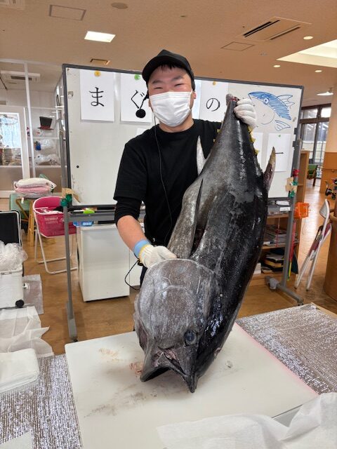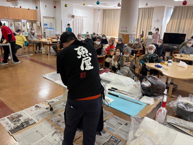 さんすまいる唐原のデイサービスのイベントにて令和7年12月12日に毎年恒例のプロによるマグロの解体ショーを今年も開催しました!!今年は約20キロの大きなマグロを目の前で解体してもらい、美味しい新鮮なお刺身をいただきました。皆さん大喜びの大人気のイベントです☆